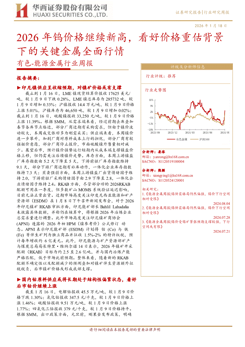 有色~能源金属行业:华西证券-有色~能源金属行业周报:2026年钨价格继续新高,看好价格重估背景下的关键金属全面行情-260118