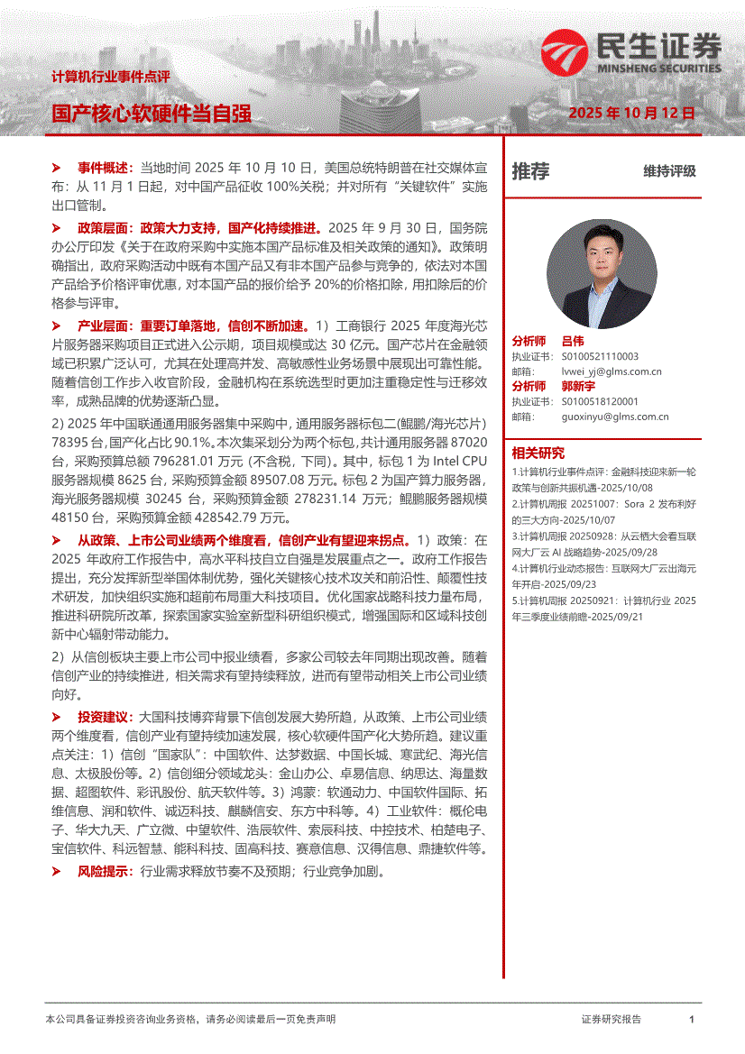计算机行业:民生证券-计算机行业事件点评:国产核心软硬件当自强-251012