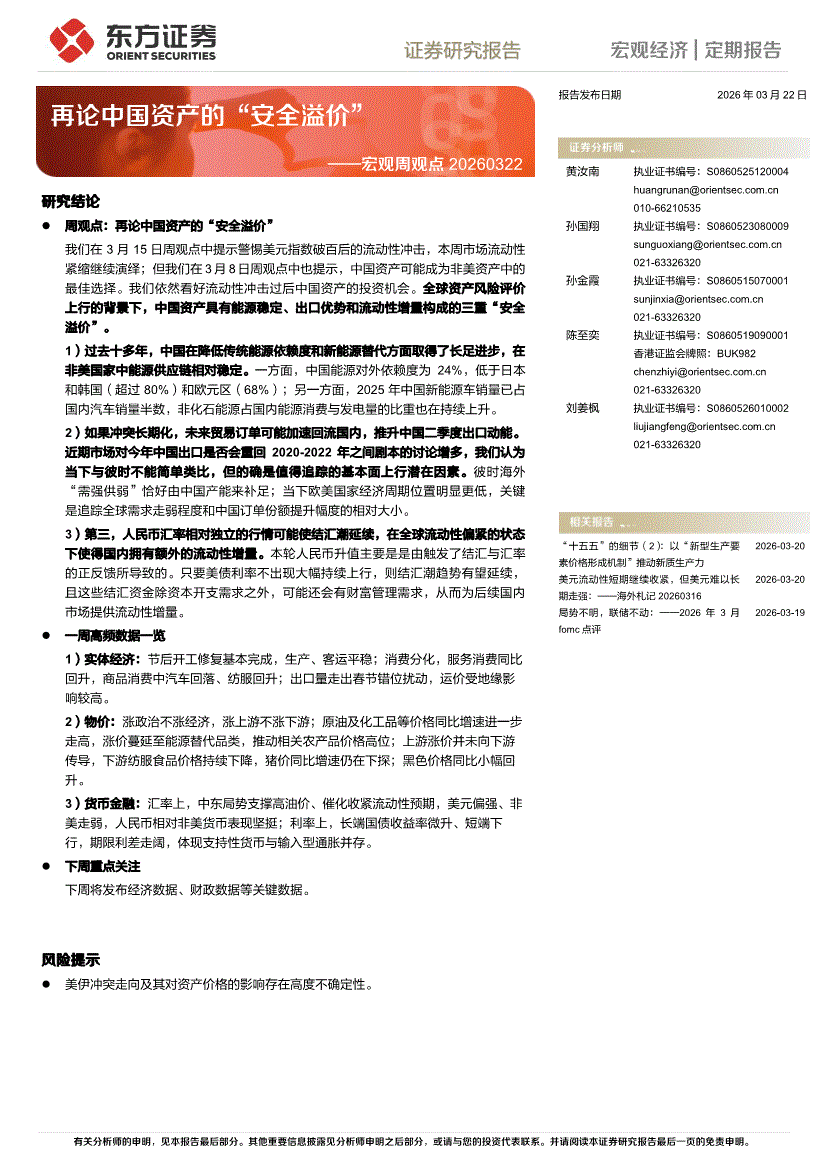 东方证券-宏观周观点:再论中国资产的“安全溢价”-260322