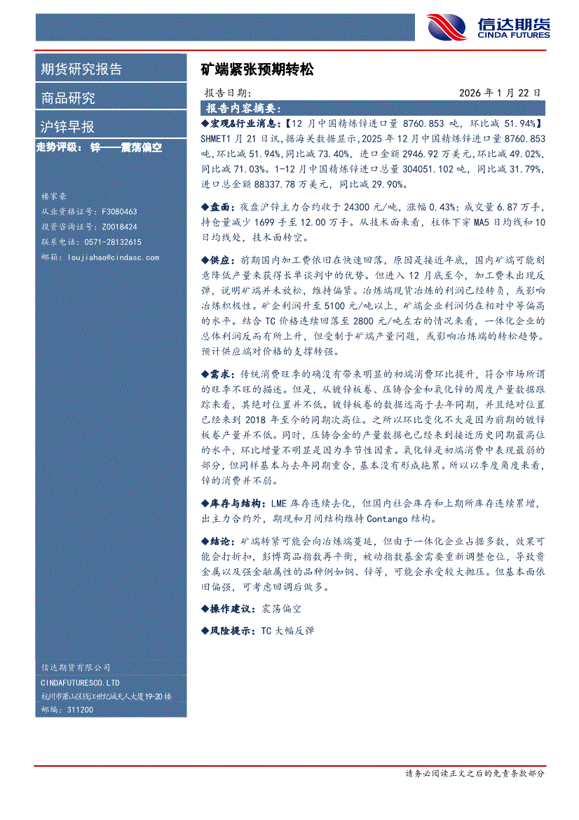 信达期货-沪锌早报:矿端紧张预期转松-260122