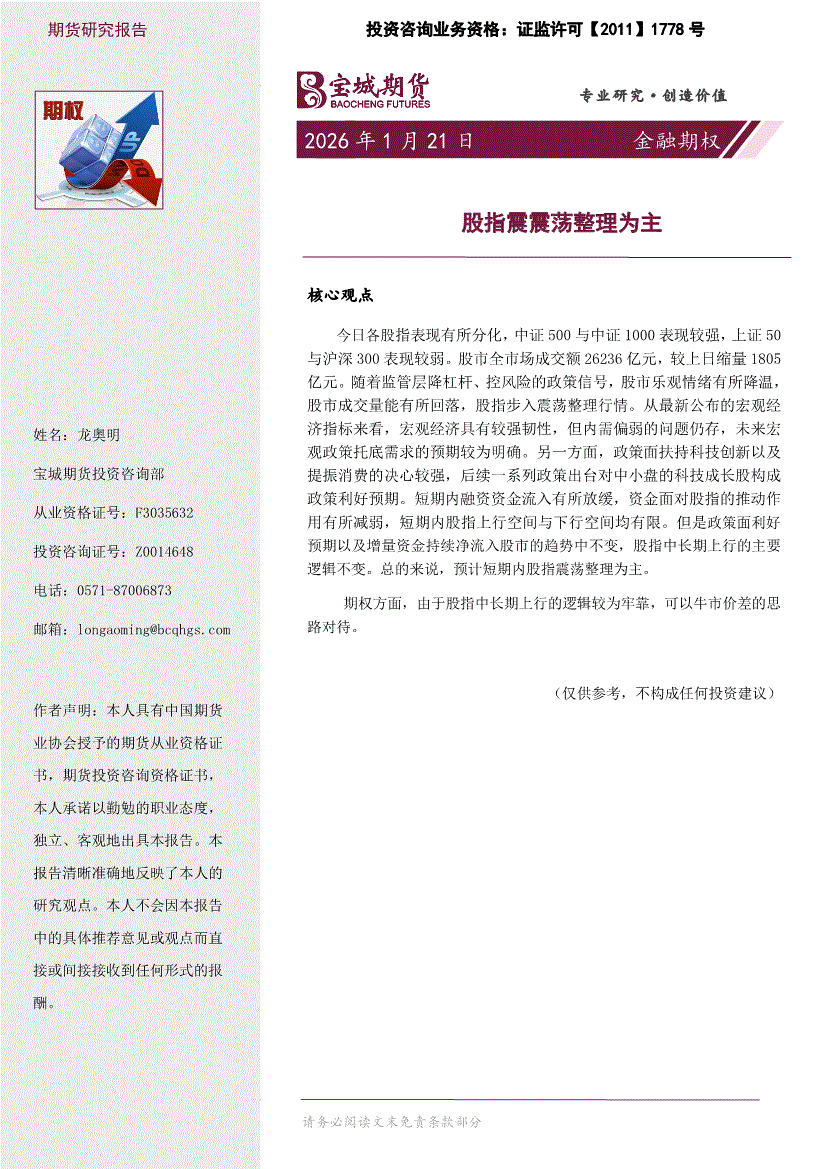 宝城期货-金融期权日报:股指震震荡整理为主-260121
