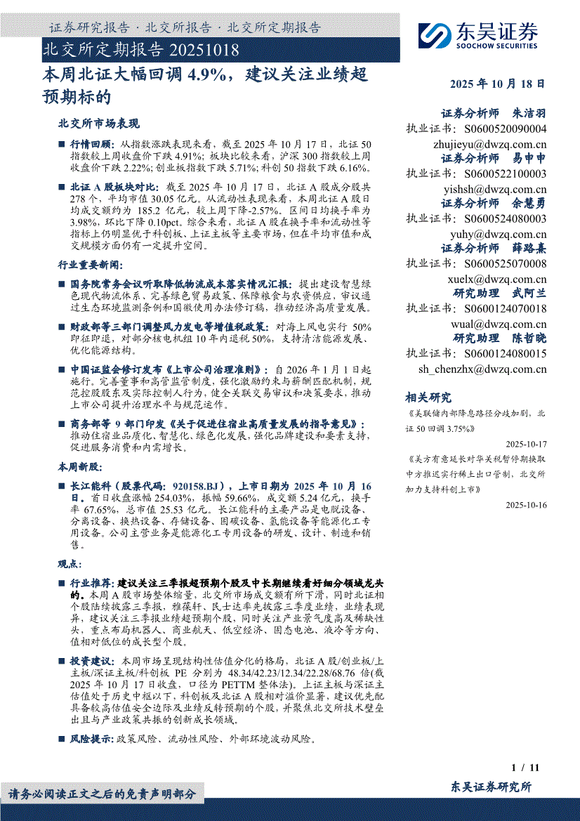 东吴证券-北交所定期报告:本周北证大幅回调4.9%,建议关注业绩超预期标的-251018