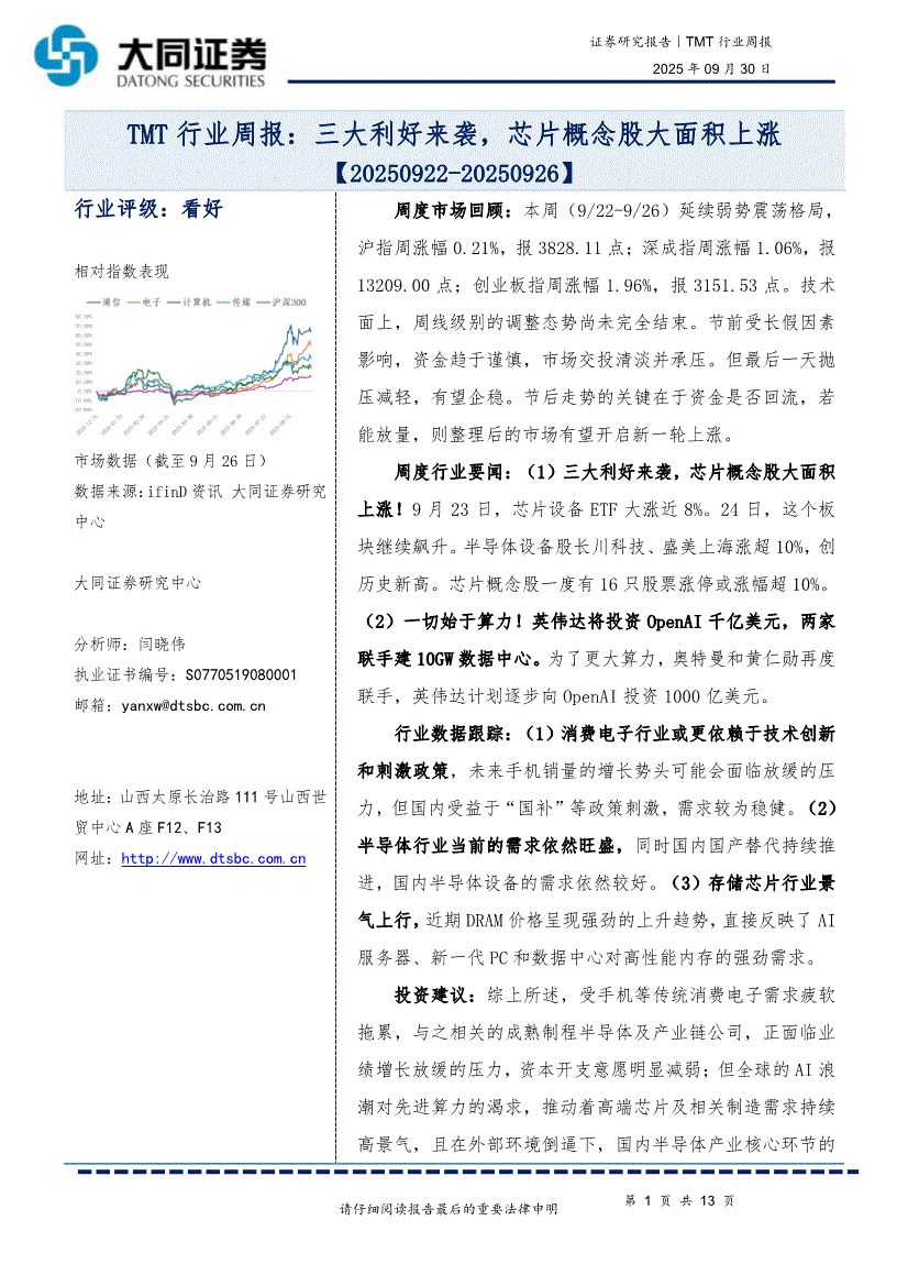TMT行业:大同证券-TMT行业周报:三大利好来袭,芯片概念股大面积上涨-250930