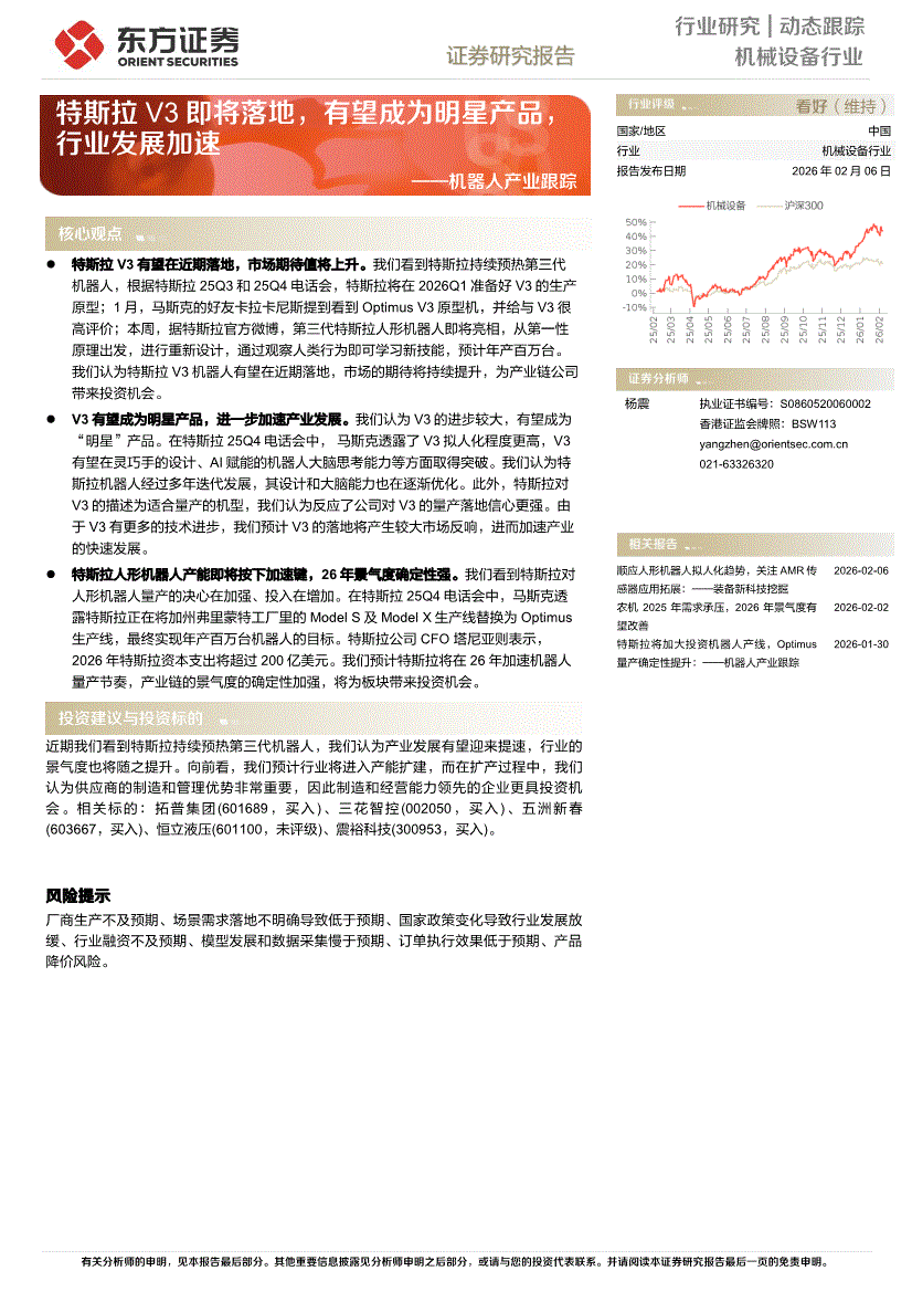 机器人行业:东方证券-机器人产业跟踪:特斯拉V3即将落地,有望成为明星产品,行业发展加速-260206