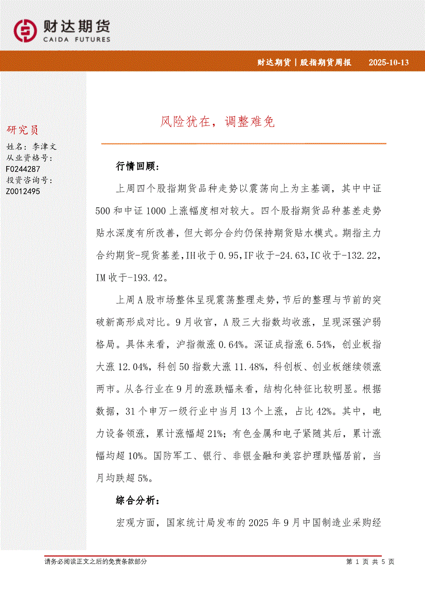 财达期货-股指期货周报:风险犹在,调整难免-251013