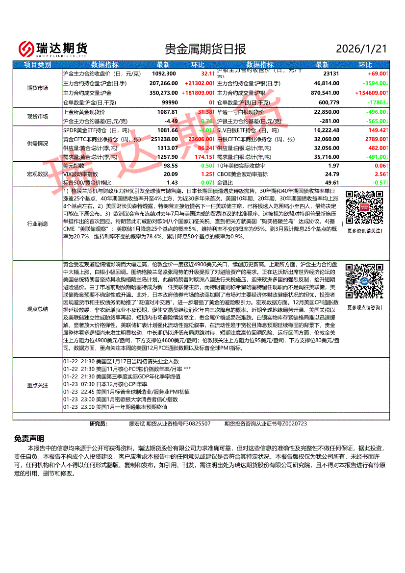 瑞达期货-贵金属期货日报-260121