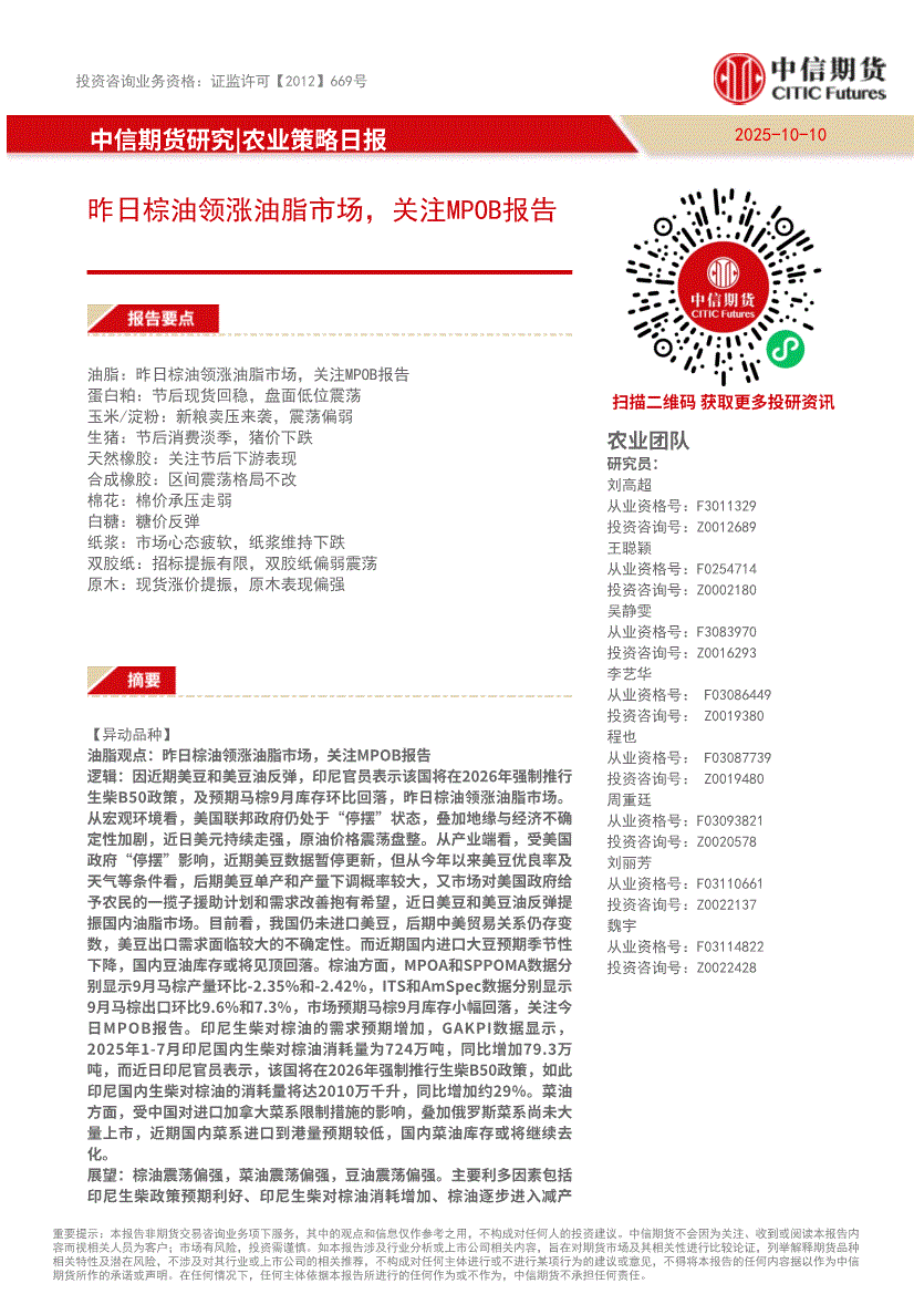 中信期货-农业策略日报:昨日棕油领涨油脂市场,关注MPOB报告-251010