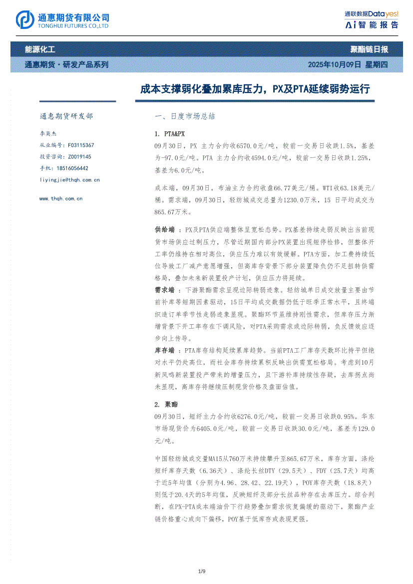 通惠期货-聚酯链日报:成本支撑弱化叠加累库压力,PX及PTA延续弱势运行-251009