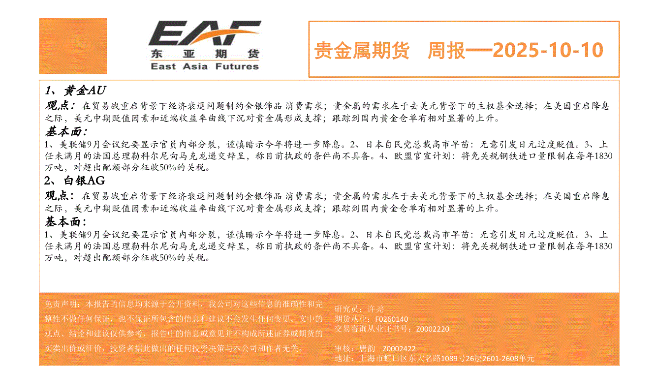 上海东亚期货-贵金属期货周报-251010