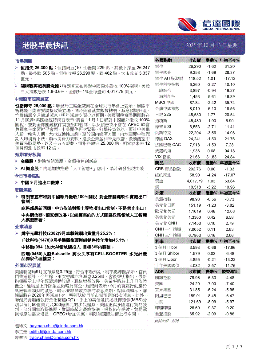 信达国际-港股早晨快讯-251013