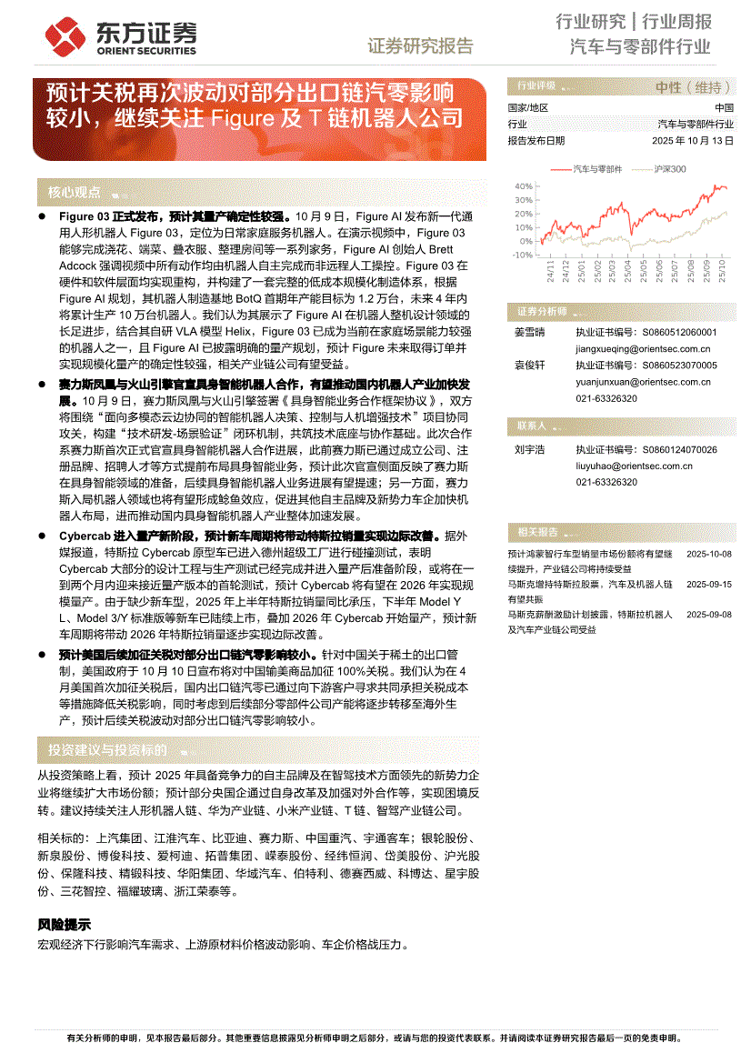 汽车与零部件行业:东方证券-汽车与零部件行业周报:预计关税再次波动对部分出口链汽零影响较小,继续关注Figure及T链机器人公司-251013