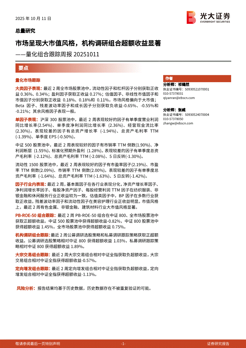 光大证券-量化组合跟踪周报:市场呈现大市值风格,机构调研组合超额收益显著-251011