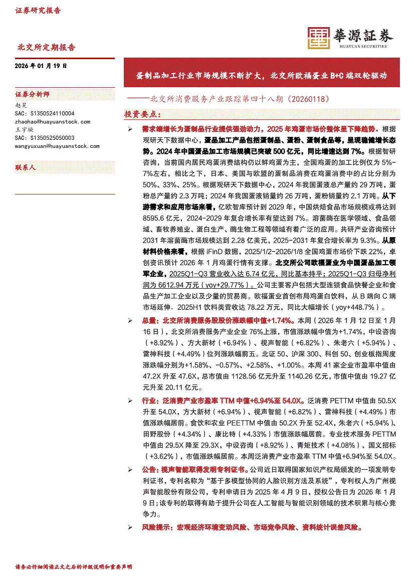 华源证券-北交所消费服务产业跟踪第四十八期:蛋制品加工行业市场规模不断扩大,北交所欧福蛋业B+C端双轮驱动-260119