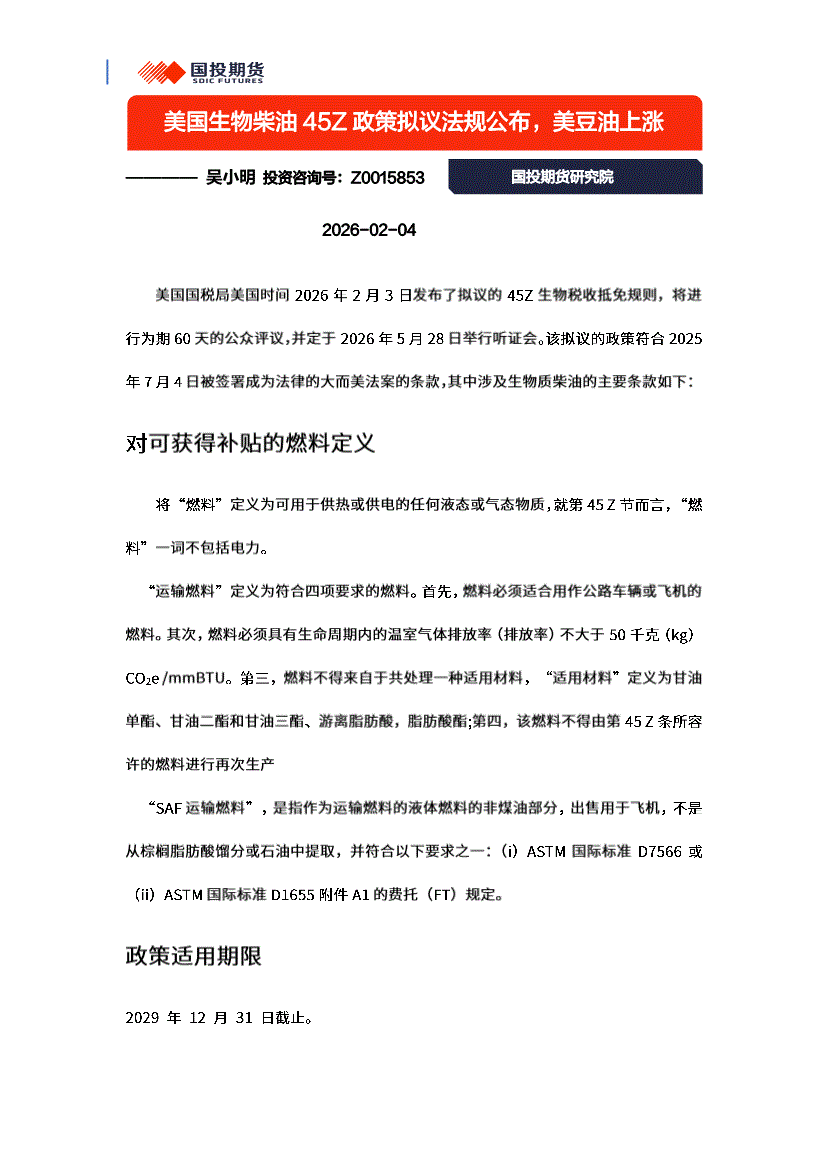 国投期货-美国生物柴油45Z政策拟议法规公布,美豆油上涨-260204