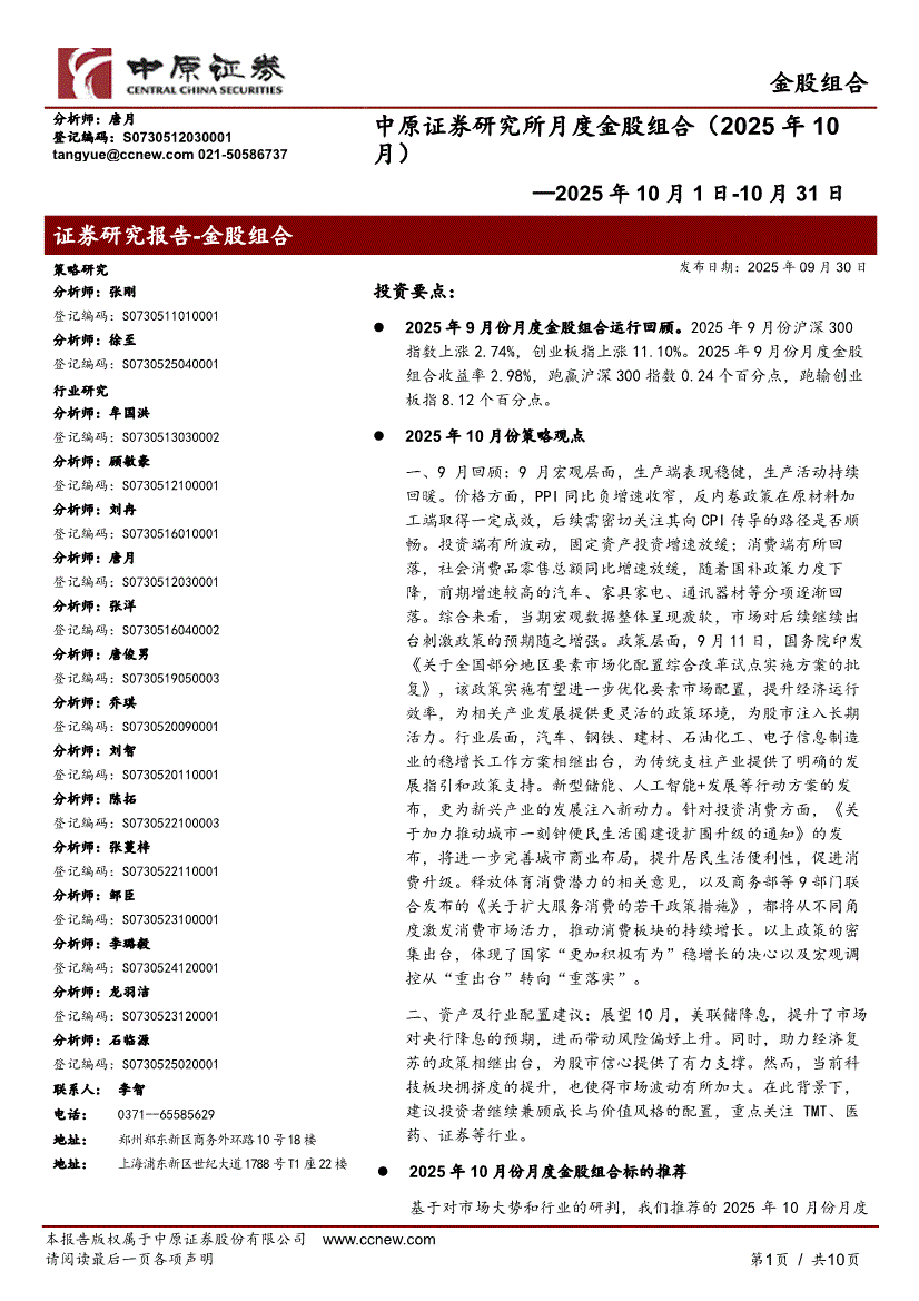 中原证券-月度金股组合(2025年10月):2025年10月1日~10月31日-250930