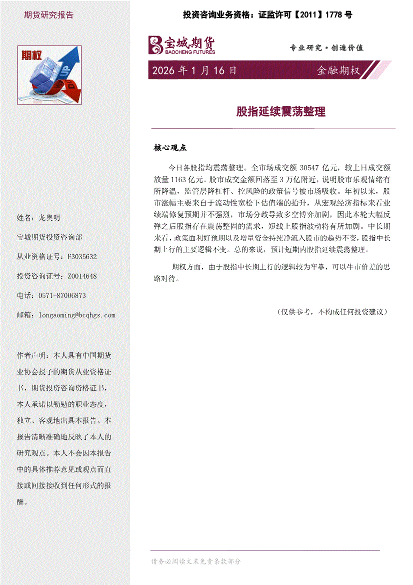宝城期货-金融期权日报:股指延续震荡整理-260116