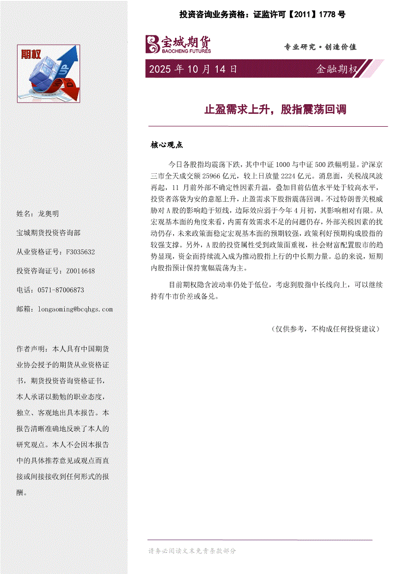宝城期货-金融期权日报:止盈需求上升,股指震荡回调-251014