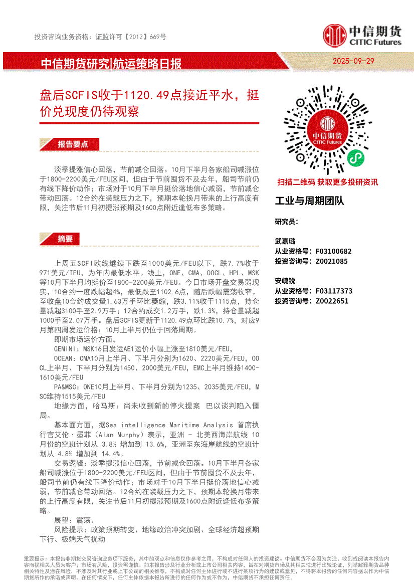 中信期货-航运策略日报:盘后SCFIS收于1120.49点接近平水,挺价兑现度仍待观察-250929