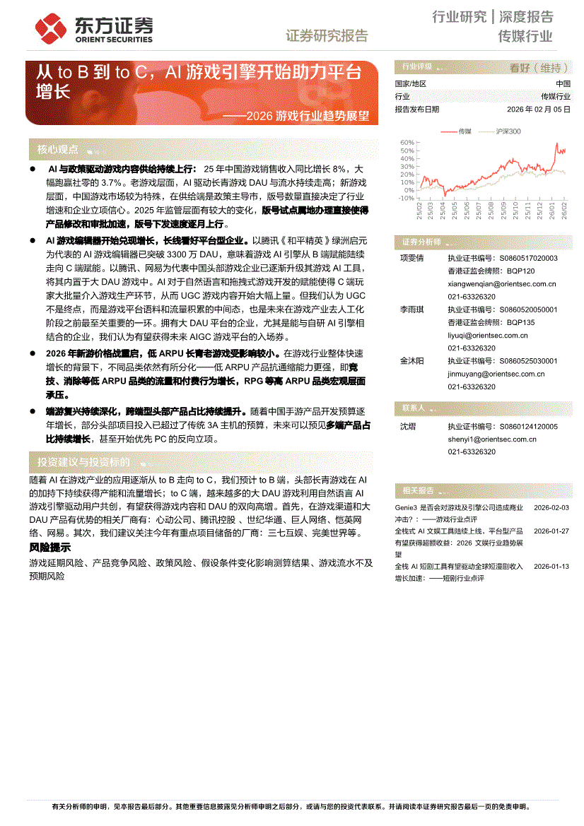 传媒行业:东方证券-2026游戏行业趋势展望:从to B到to C,AI游戏引擎开始助力平台增长-260205