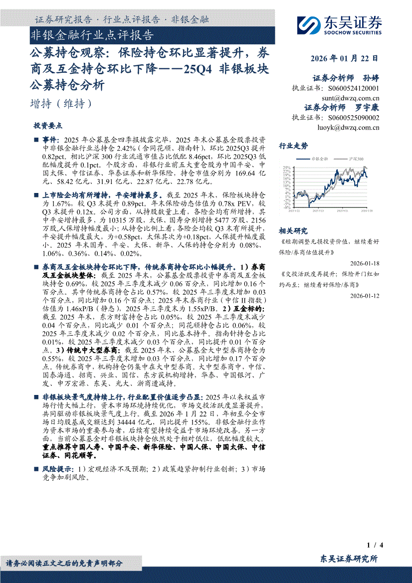 非银金融行业:东吴证券-非银金融行业点评报告:公募持仓观察,保险持仓环比显著提升,券商及互金持仓环比下降——25Q4非银板块公募持仓分析-260122