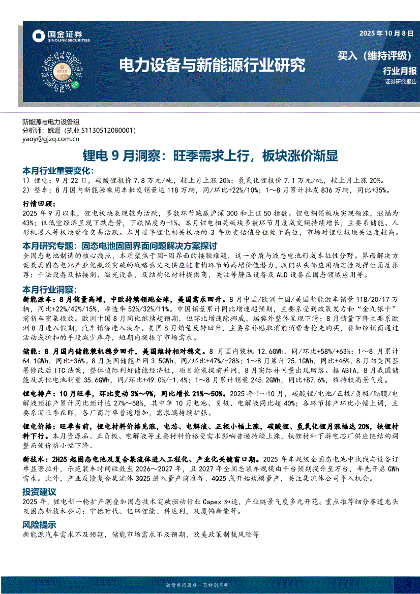 电力设备与新能源行业:国金证券-电力设备与新能源行业锂电9月洞察:旺季需求上行,板块涨价渐显-251008