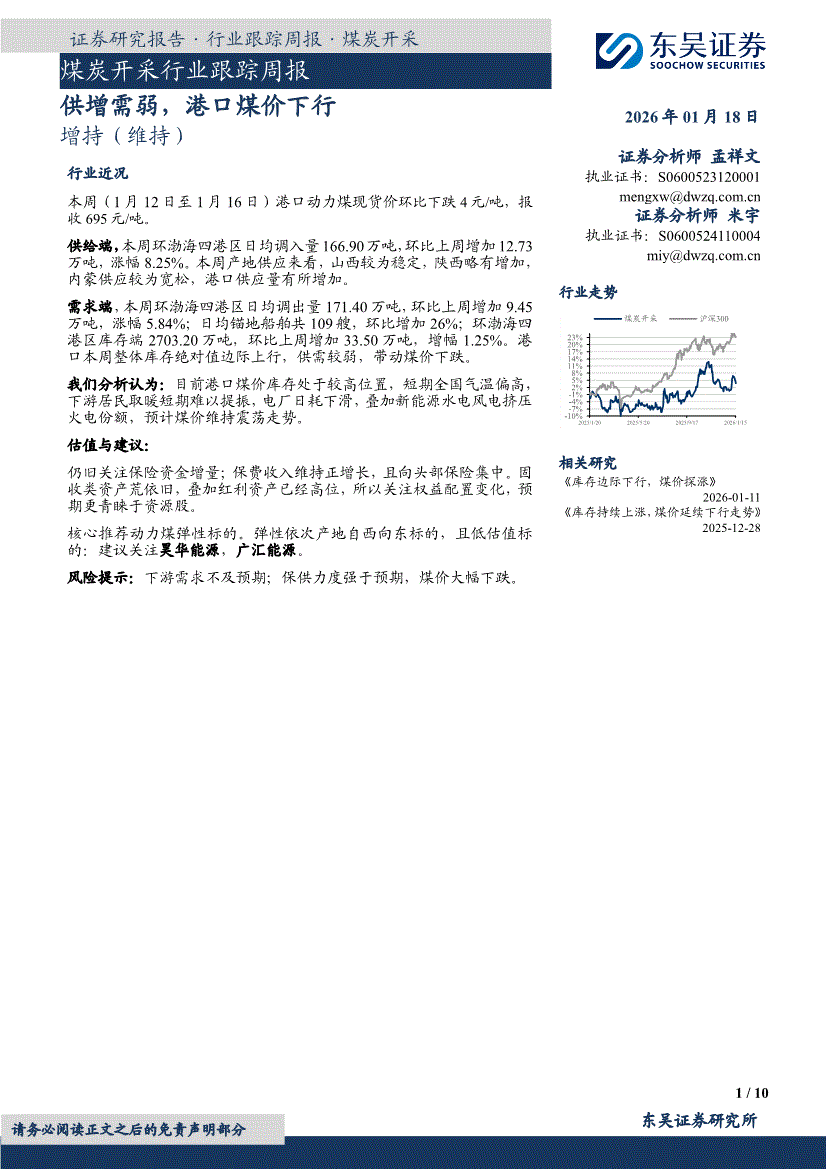 煤炭开采行业:东吴证券-煤炭开采行业跟踪周报:供增需弱,港口煤价下行-260118