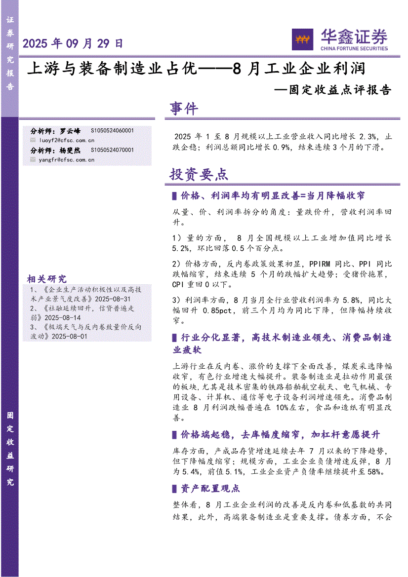 华鑫证券-固定收益点评报告:上游与装备制造业占优——8月工业企业利润-250929