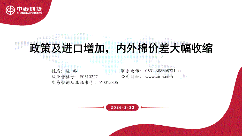 中泰期货-政策及进口增加,内外棉价差大幅收缩-260322
