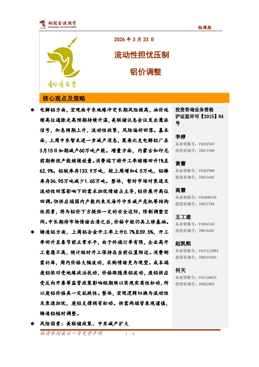 铜冠金源期货-铝周报:流动性担忧压制,铝价调整-260323