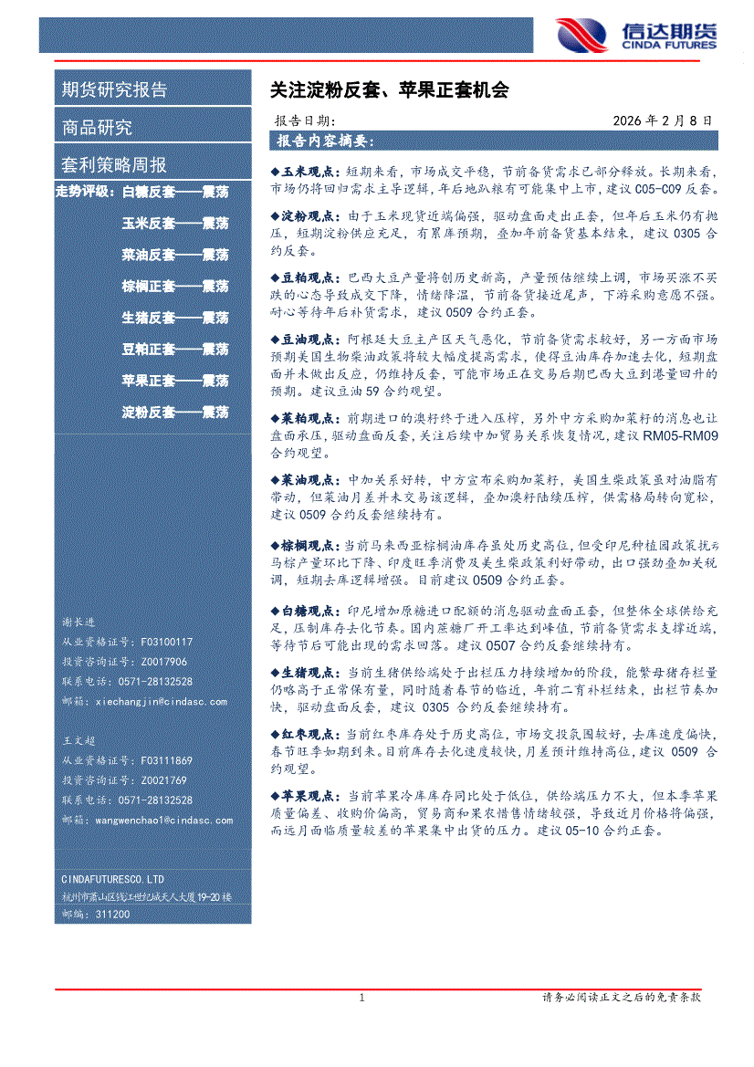 信达期货-套利策略周报:关注淀粉反套、苹果正套机会-260208