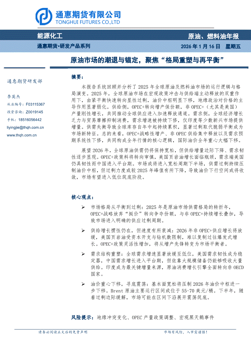通惠期货-原油、燃料油年报:原油市场的潮退与锚定,聚焦“格局重塑与再平衡”-260116