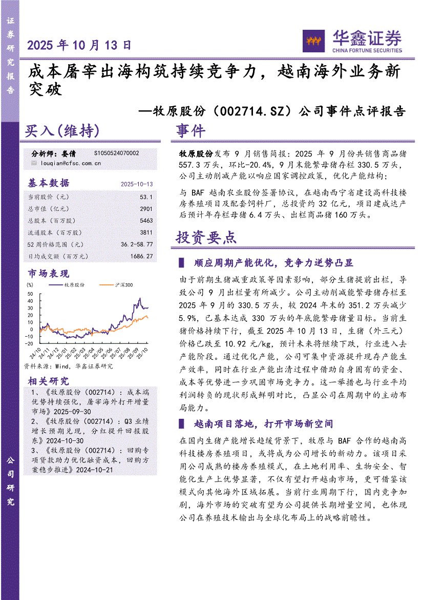 牧原股份:华鑫证券-牧原股份-002714-公司事件点评报告:成本屠宰出海构筑持续竞争力,越南海外业务新突破-251013