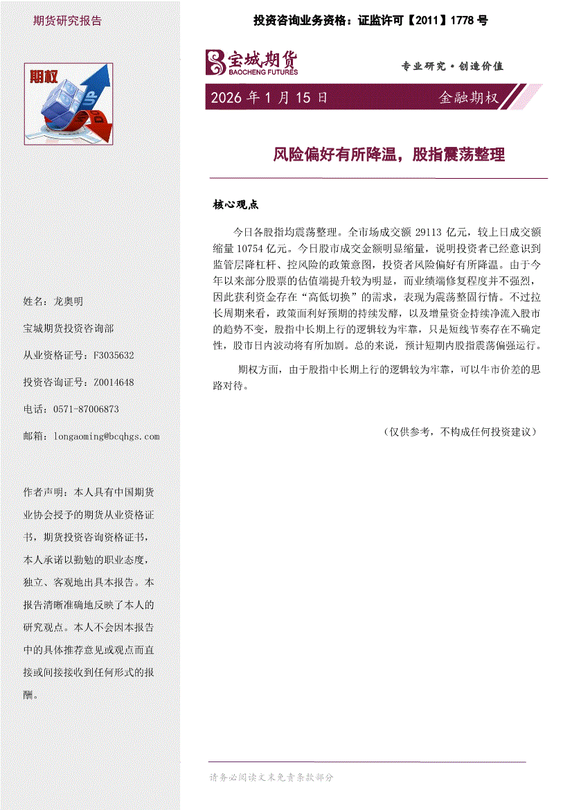 宝城期货-金融期权日报:风险偏好有所降温,股指震荡整理-260115