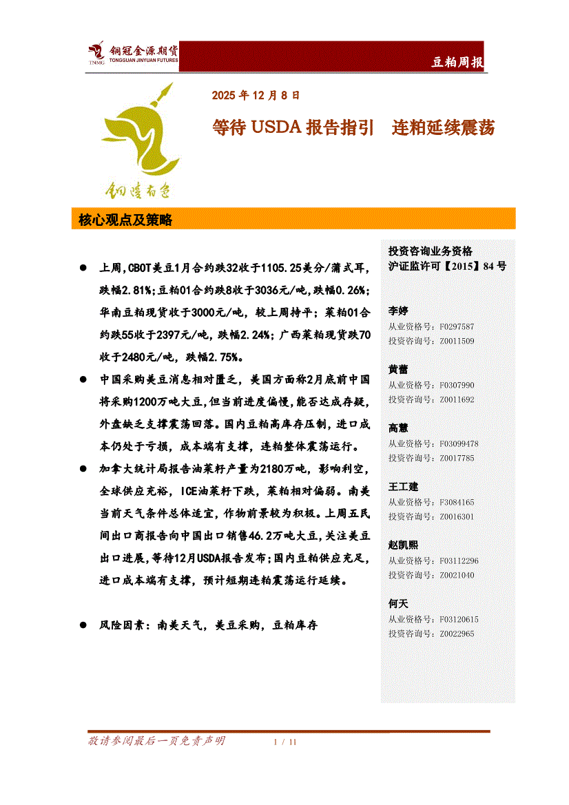 铜冠金源期货-豆粕周报:等待USDA报告指引,豆粕延续震荡-251208