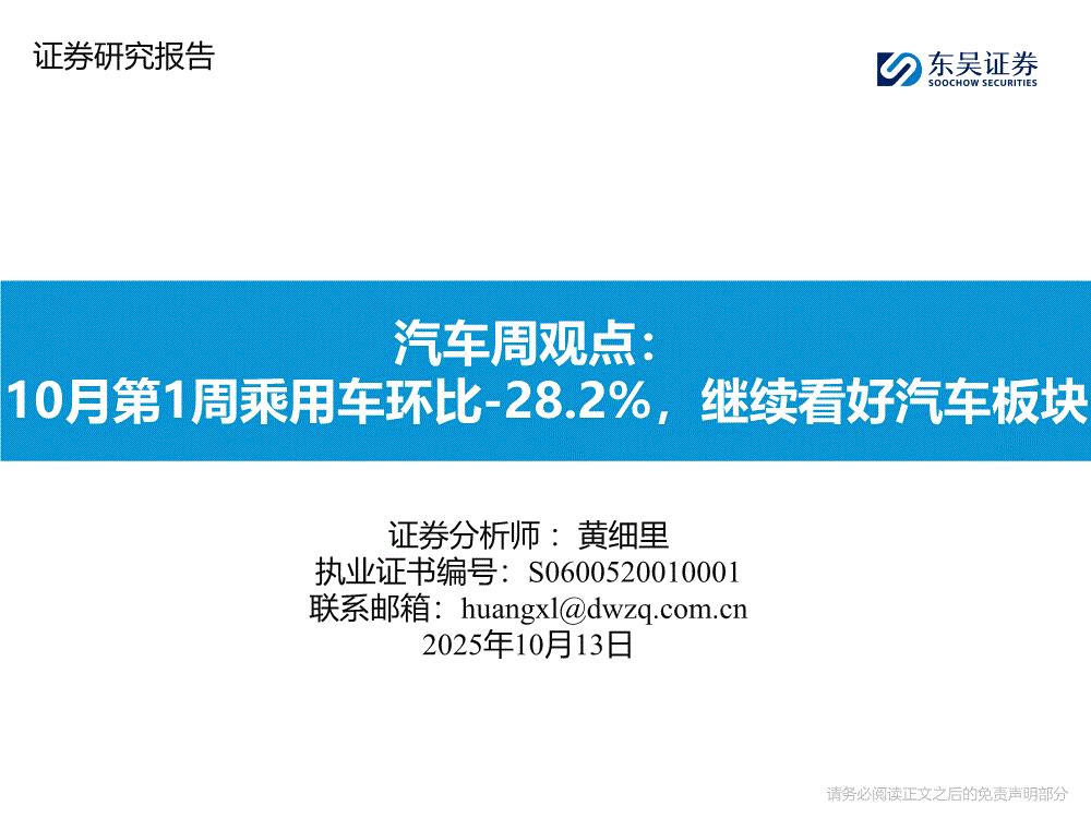 汽车行业:东吴证券-汽车行业周观点:10月第1周乘用车环比下降28.2%,继续看好汽车板块-251013
