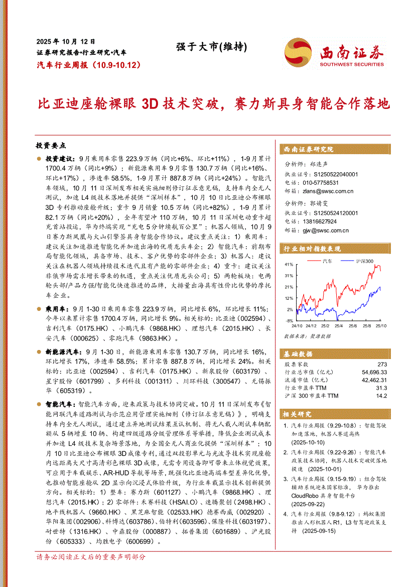 汽车行业:西南证券-汽车行业周报:比亚迪座舱裸眼3D技术突破,赛力斯具身智能合作落地-251012