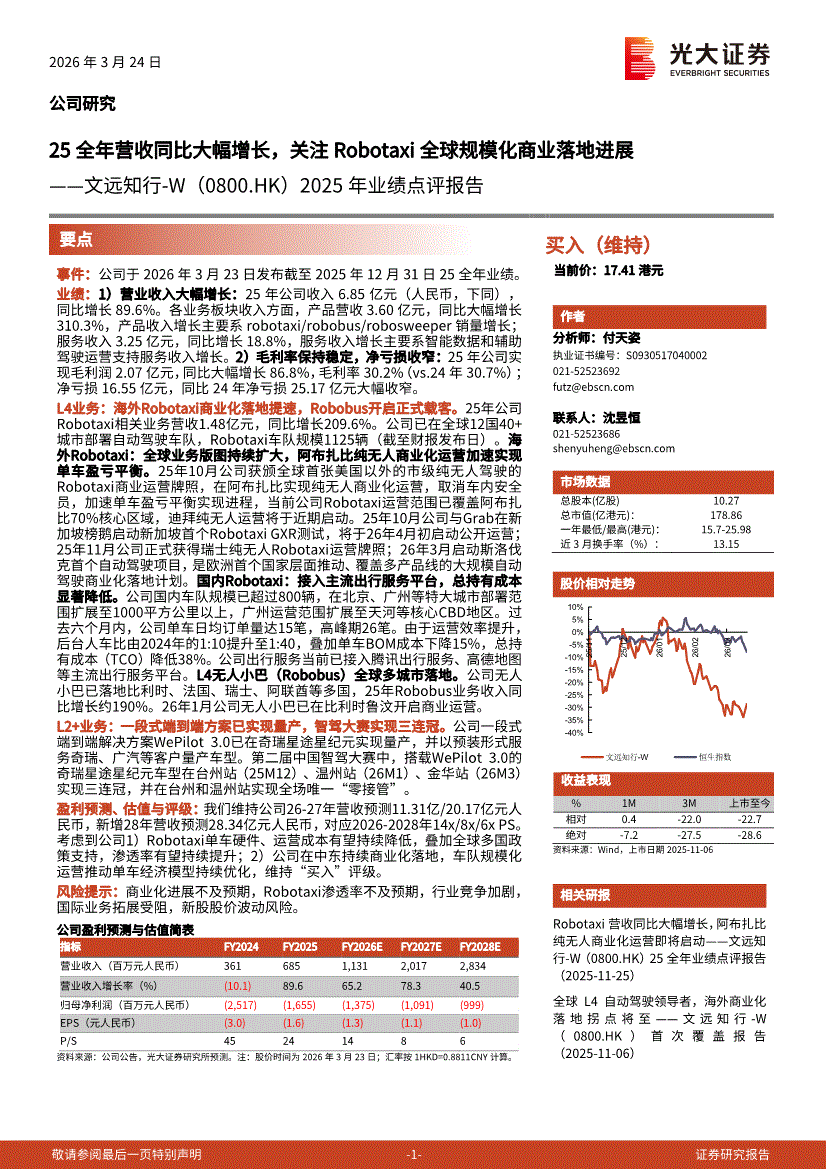 文远知行~W:光大证券-文远知行~W-0800.HK-2025年业绩点评报告:25全年营收同比大幅增长,关注Robotaxi全球规模化商业落地进展-260324
