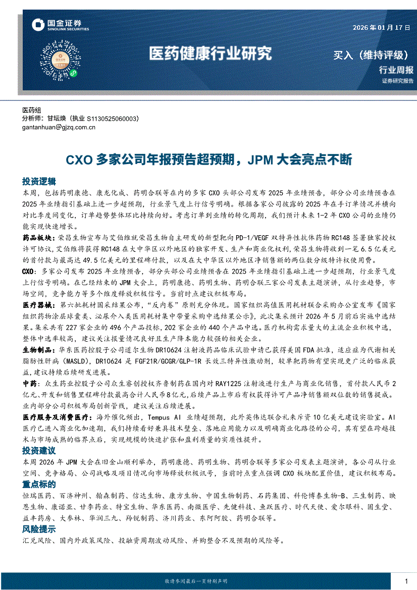 医药健康行业:国金证券-医药健康行业周报:CXO多家公司年报预告超预期,JPM大会亮点不断-260117