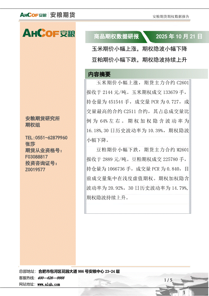 安粮期货-商品期权数据研报:玉米期价小幅上涨,期权隐波小幅下降,豆粕期价小幅下跌,期权隐波持续上升-251021