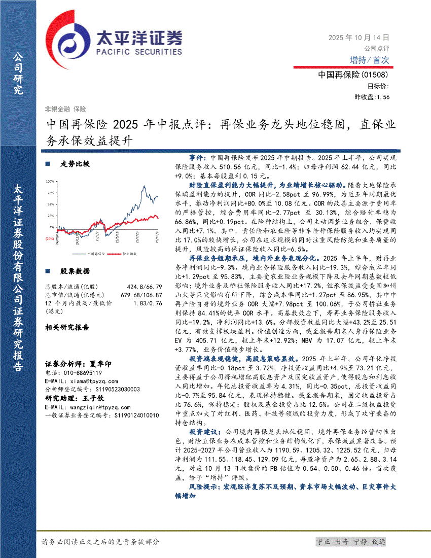 中国再保险:太平洋证券-中国再保险-1508.HK-2025年中报点评:再保业务龙头地位稳固,直保业务承保效益提升-251014