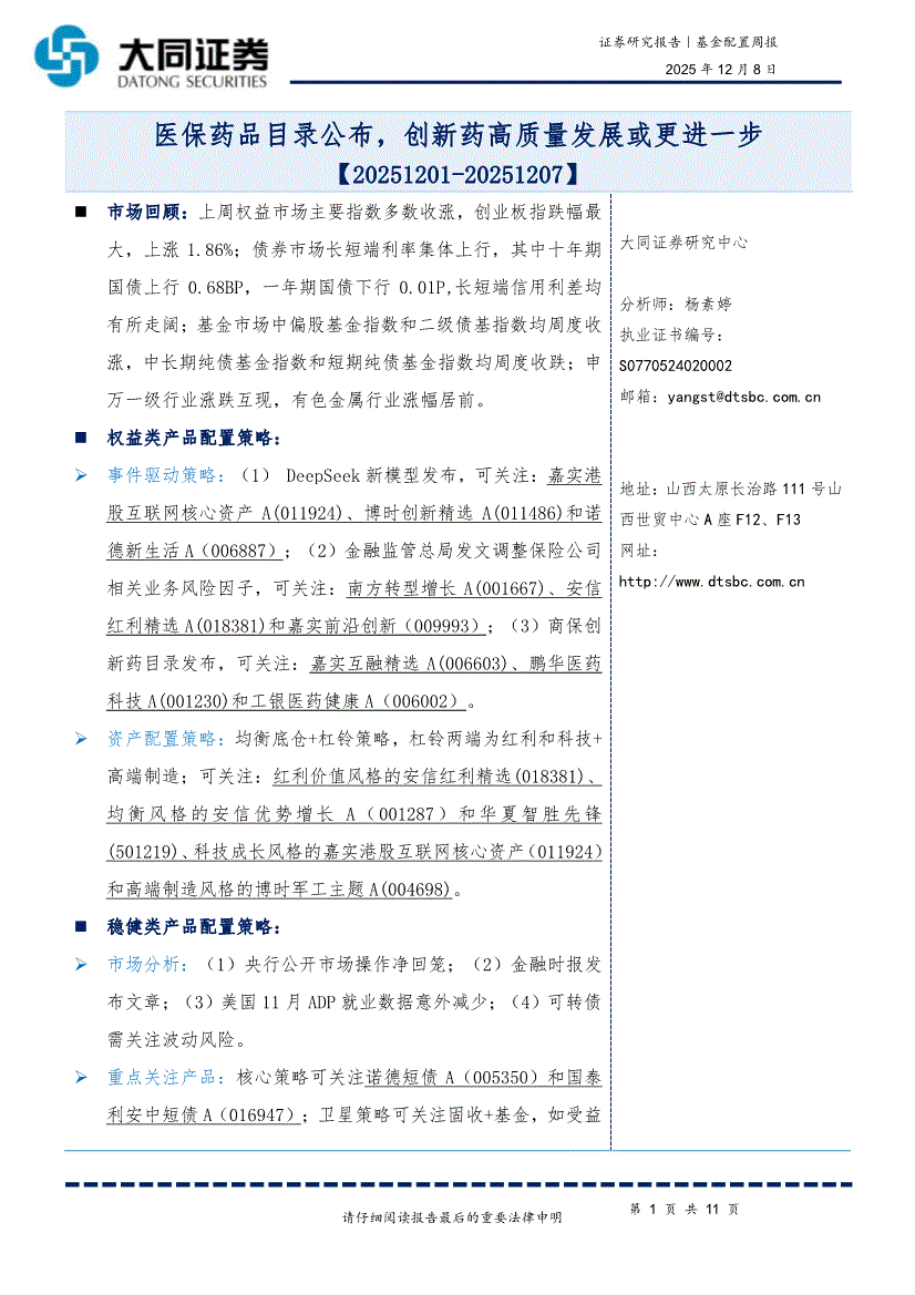 大同证券-基金配置周报:医保药品目录公布,创新药高质量发展或更进一步-251208