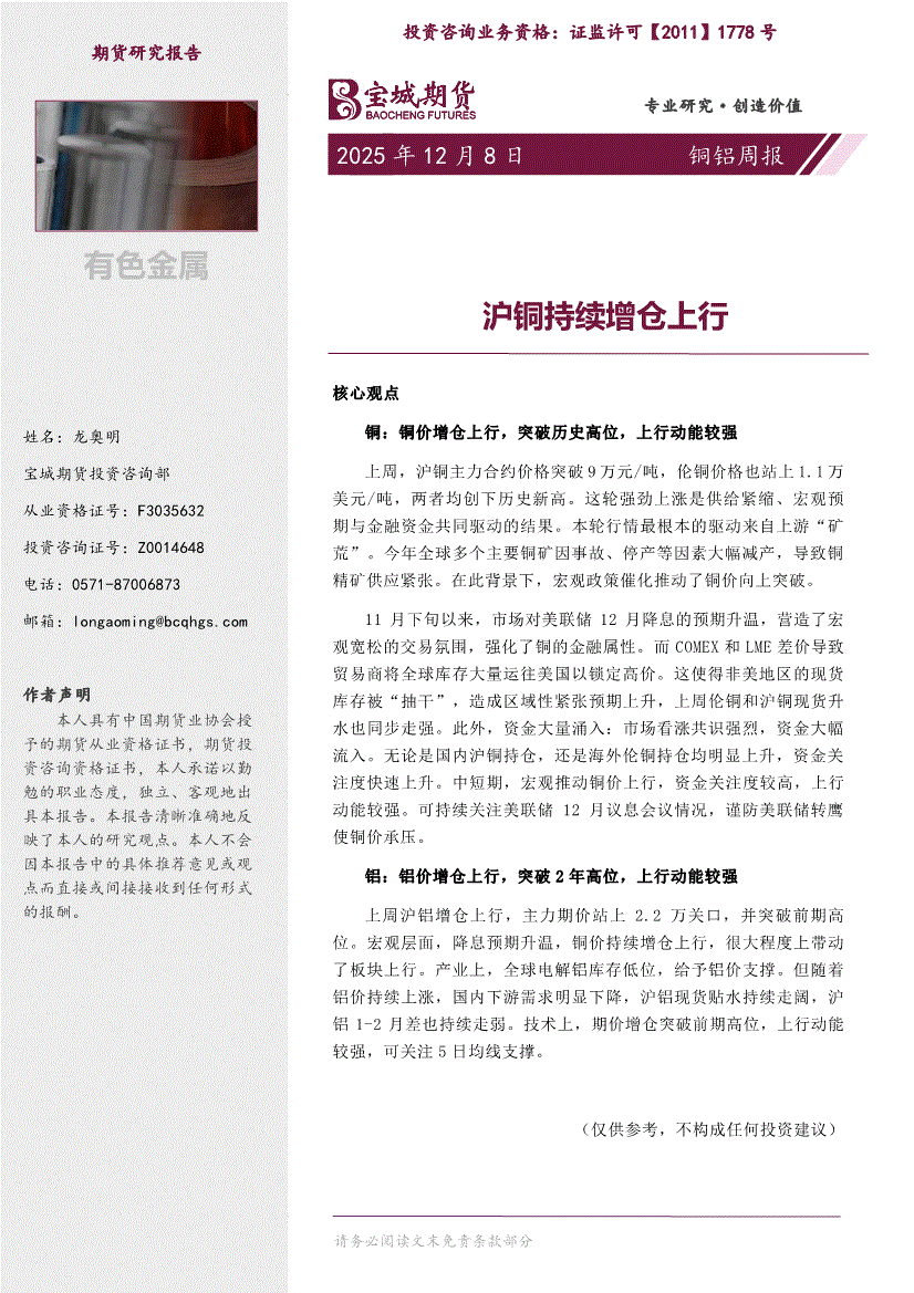 宝城期货-铜铝周报:沪铜持续增仓上行-251208
