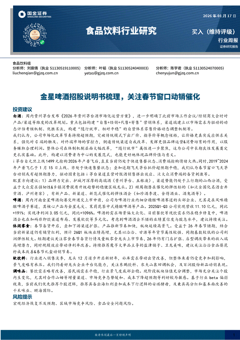食品饮料行业:国金证券-食品饮料行业周报:金星啤酒招股说明书梳理,关注春节窗口动销催化-260117