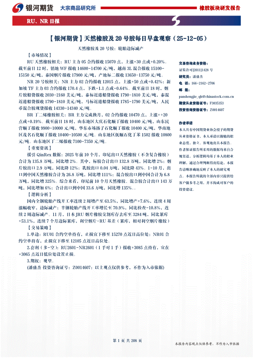 银河期货-天然橡胶及20号胶每日早盘观察-251205
