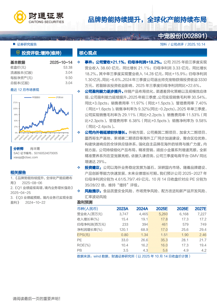 中宠股份:财通证券-中宠股份-002891-品牌势能持续提升,全球化产能持续布局-251014