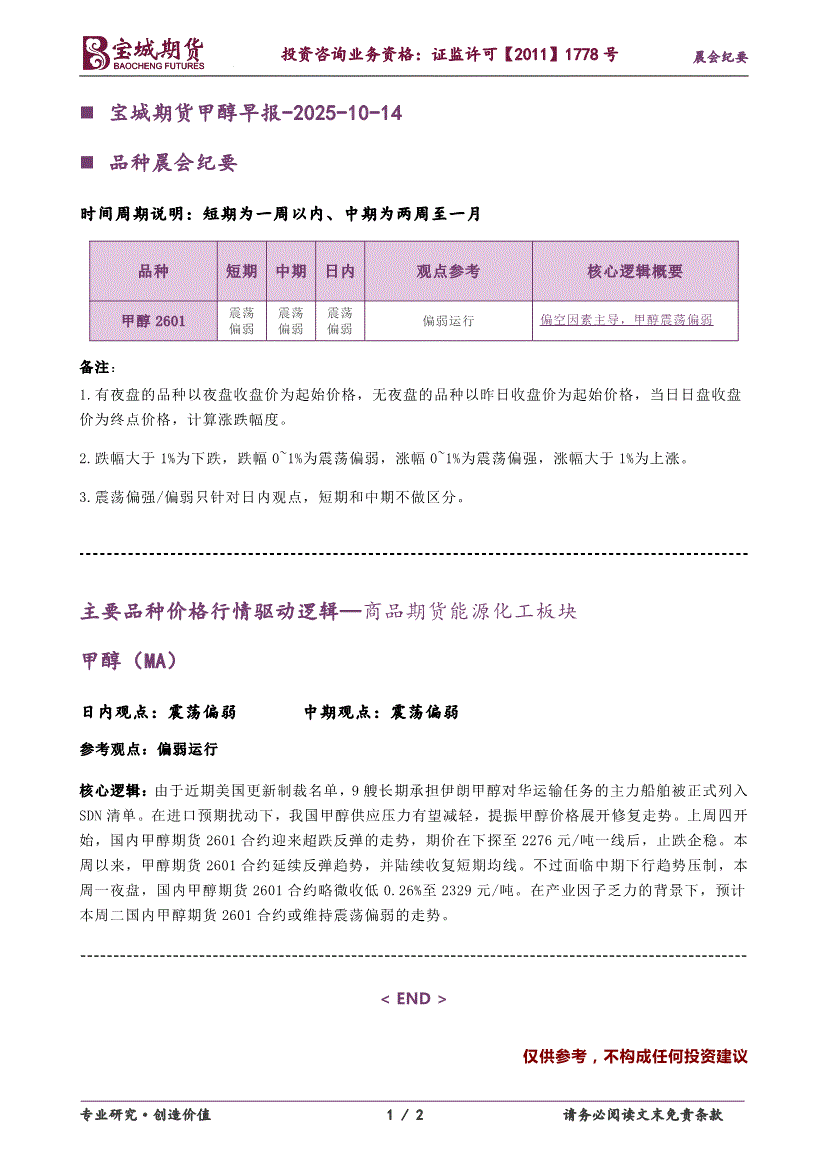 宝城期货-甲醇早报-251014