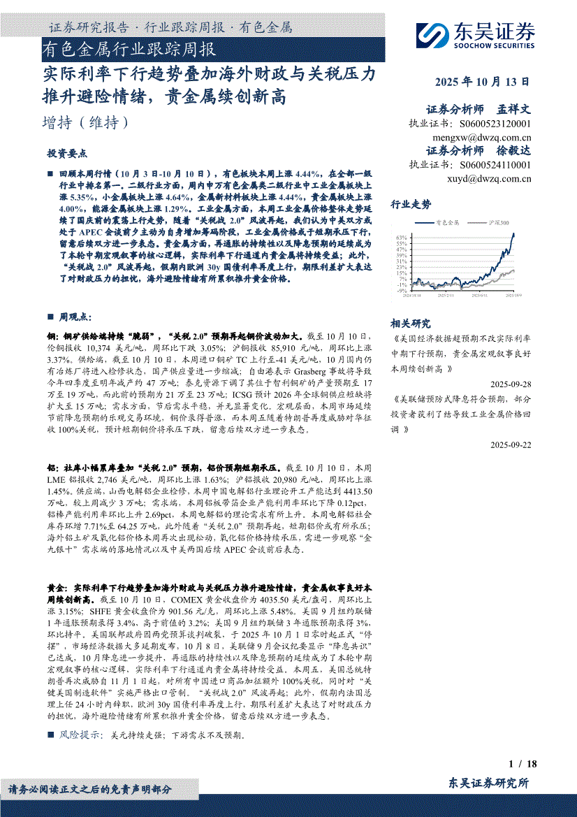 有色金属行业:东吴证券-有色金属行业跟踪周报:实际利率下行趋势叠加海外财政与关税压力推升避险情绪,贵金属续创新高-251013