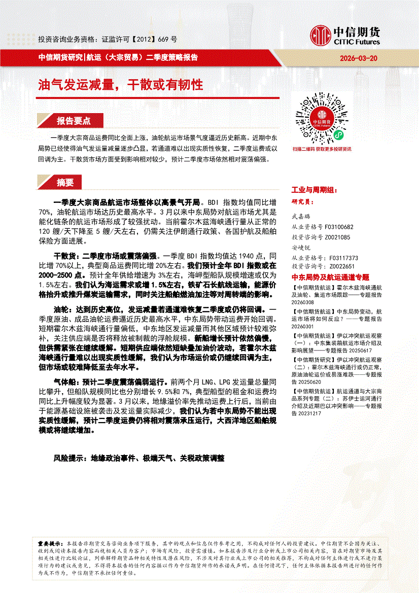 中信期货-航运(大宗贸易)二季度策略报告:油气发运减量,干散或有韧性-260320