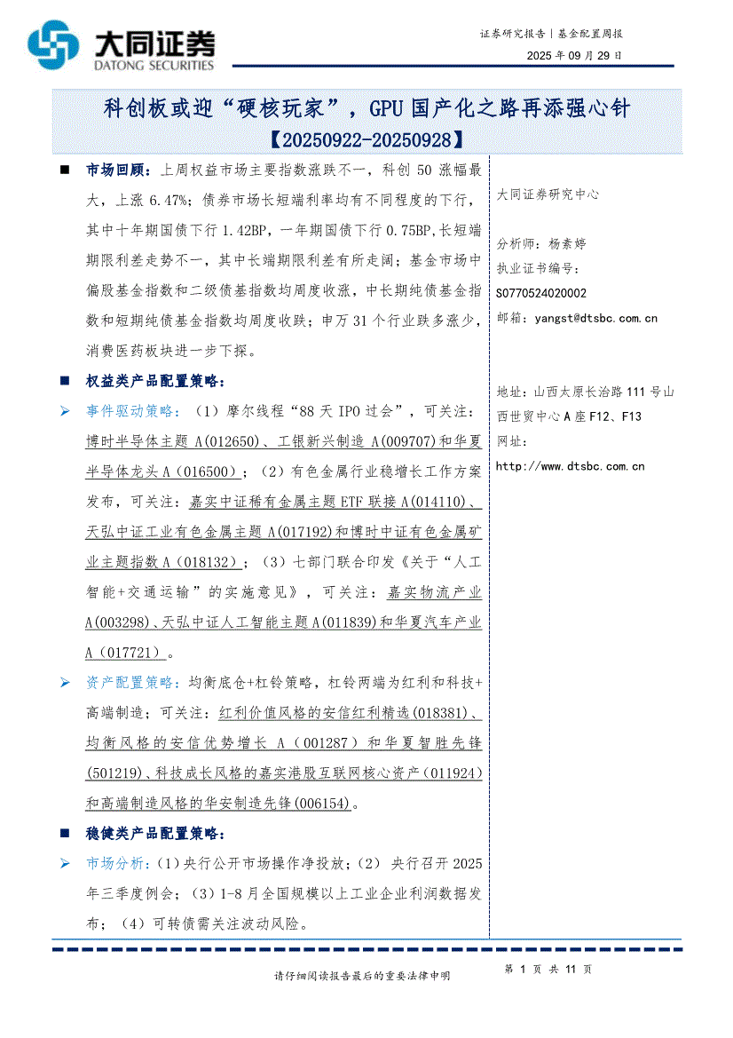 大同证券-基金配置周报:科创板或迎“硬核玩家”,GPU国产化之路再添强心针-250929