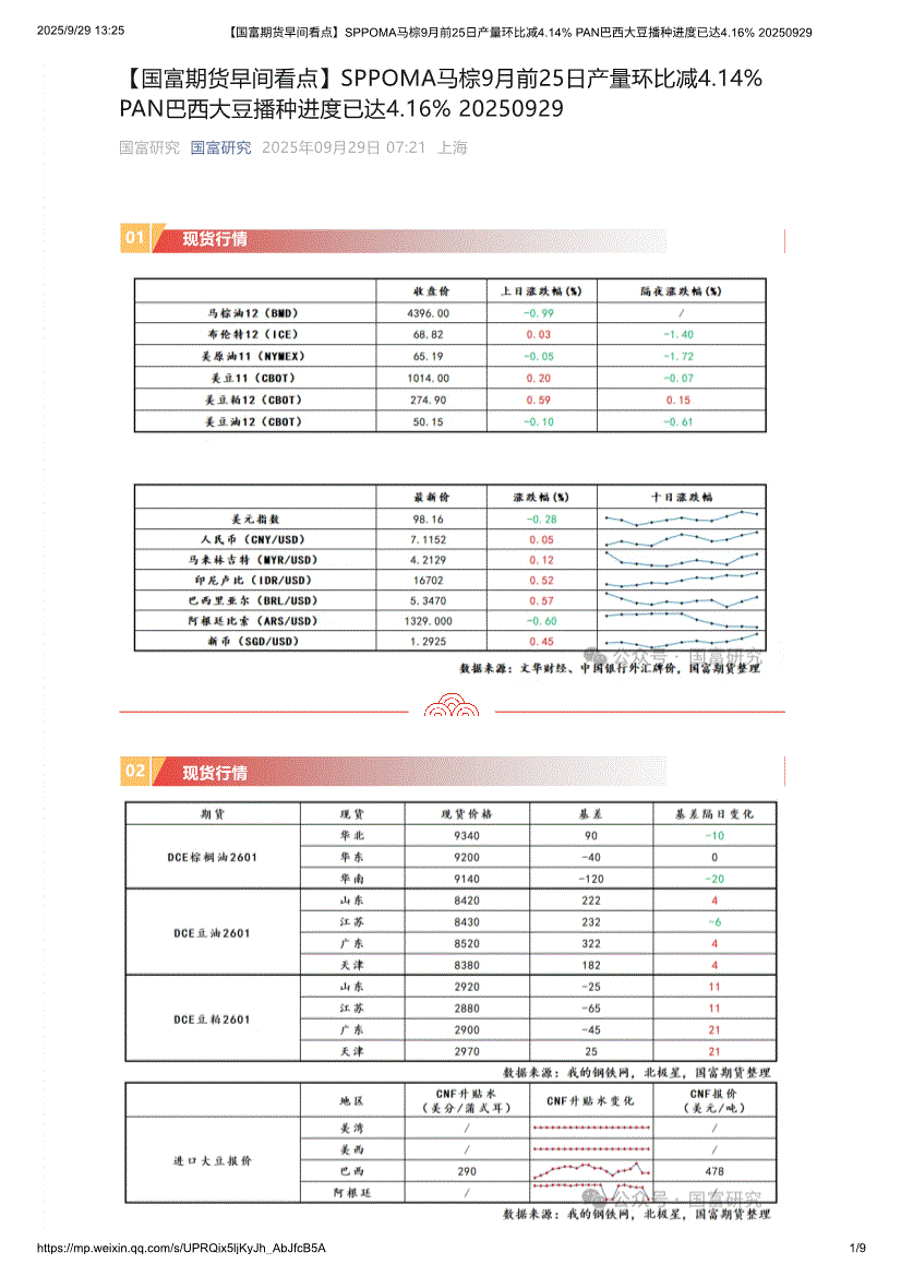 国富期货-【国富期货早间看点】SPPOMA马棕9月前25日产量环比减4.14%,PAN巴西大豆播种进度已达4.16%-250929